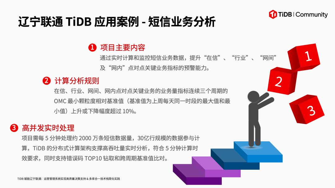 在数字化转型浪潮中,通信行业面临着数据量爆发式增长和业务场景多元化的双重挑战。辽宁联通作为东北地区领先的通信企业,通过引入 TiDB 分布式数据库,成功打造了集实时分析、高可用架构、多库合一管理于一体的数据基础设施。本文基于辽宁联通网络 IT 系统架构师付昌昌在 TiDB 地区活动沈阳站的演讲内容,分享 TiDB 在辽宁联通的短信业务分析、AI 智驭工单系统、5G 网络规划等场景中的落地实践,展现如何通过 TiDB 实现企业实现降本增效、敏捷运营与智能化决策,为运营商数据库选型提供可复用的标杆案例。