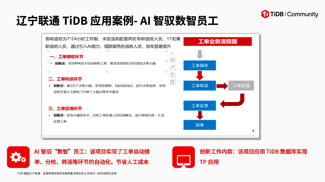 在网络运维领域,辽宁联通原有 19 人团队负责 7×24 小时工单处理,包括故障派单、进度跟踪及结单审核。传统模式下,系统响应效率低且需要耗费较高人力成本。辽宁联通基于 TiDB 实现 TP 应用,打造了 24 小时在线的智能工单处理系统。