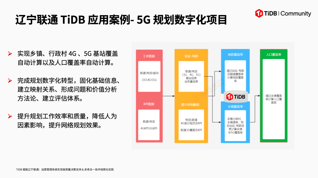 5G 规划数字化项目是 5G 网络建设的重要前置工作,建设涉及海量地理信息(如基站经纬度、人口密度)与业务数据的融合分析,需实现乡镇、行政村 4G、5G 基站覆盖、地铁隧道覆盖率和人口覆盖率等数据的自动计算。辽宁联通选择 TiDB 作为数据底座完美承接项目数据。