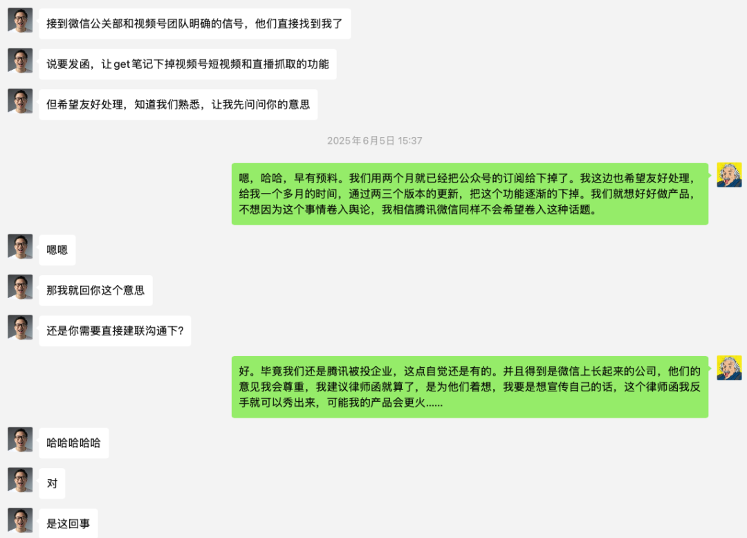 6 月 5 日,微信团队托我们双方的好朋友润宇老师来传话,希望我们下掉视频号和直播的抓取功能。我当时让润宇老师转达的反馈是“给我一个多月的时间,我来通过两三个版本的迭代,把这两个重要功能下掉。”大家可以看到我和润宇老师的聊天记录。