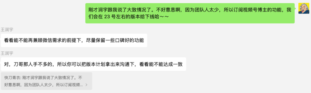 7 月 8 日,润宇老师帮我和微信的一位同学拉了一个群,追问了一下视频号功能下架的具体时间。我当时反馈的是因为团队人太少了,我们会在 7 月 23 号的版本把功能下线。这里是小群聊天截屏,我不放具体微信同学的信息了,我不希望这个事情影响到具体的人。
