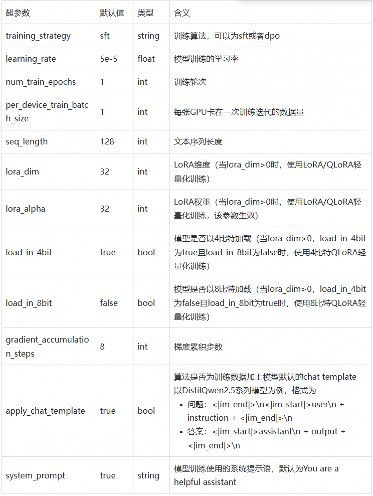PAI为DistilQwen-ThoughtX-7B模型配置了SFT和DPO两种微调算法,支持用户以开箱即用得方式对PAI-DistilQwen-ThoughtX-7B进行微调。SFT训练算法支持使用 Json 格式输入,每条数据由问题、答案组成,分别用“instruction”、“output”字段表示,例如: