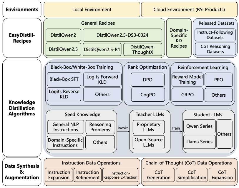 在训练大语言模型过程中,合成数据起着至关重要的作用。为解决在知识蒸馏中种子数据集规模通常有限的问题,PAI 在 EasyDistill 框架中集成了多种数据合成和增强操作,利用专有和开源的教师模型,显著提升训练数据规模与多样性。