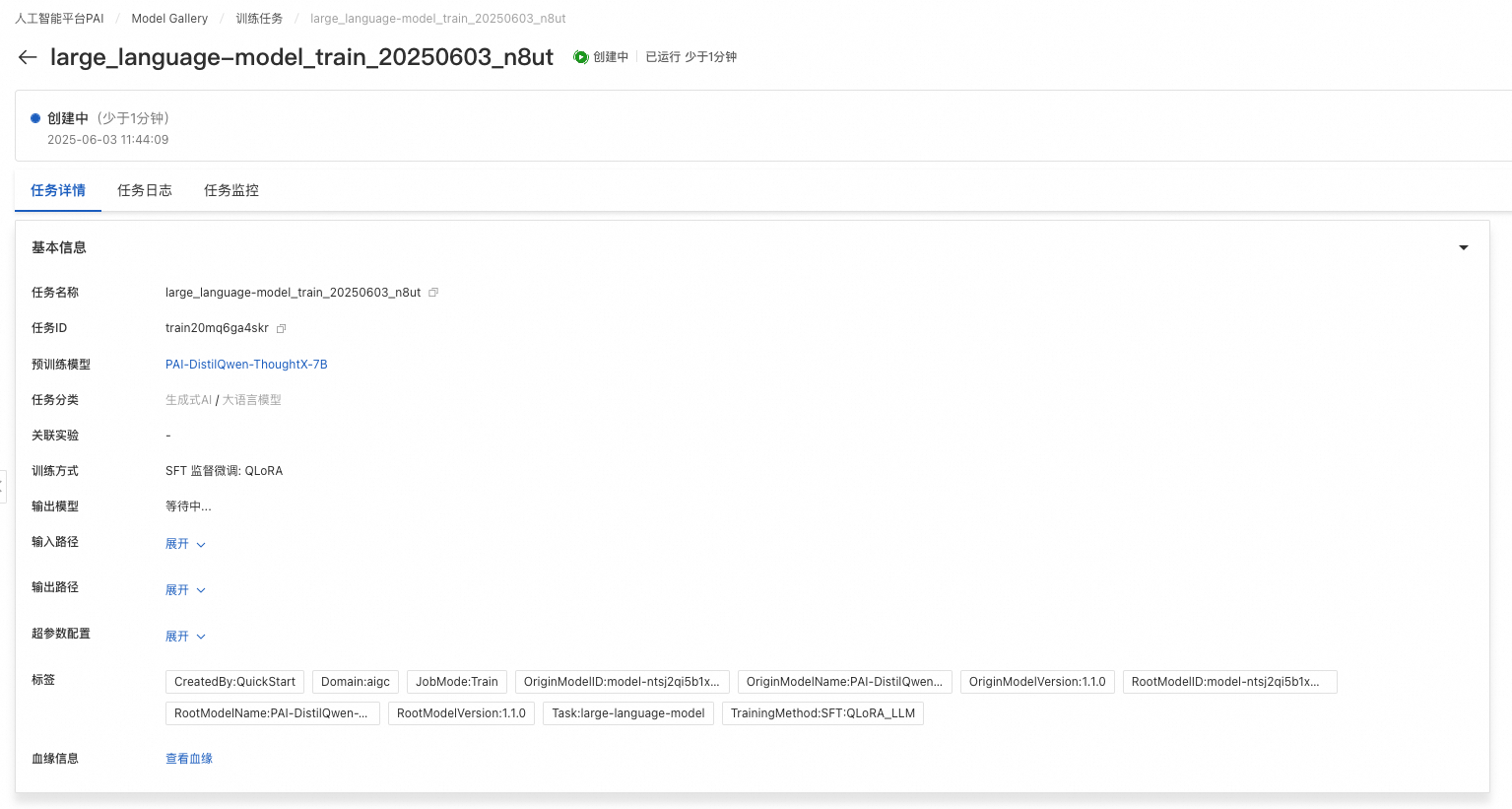点击“训练”按钮在PAI- Model Gallery上开始进行训练,用户可以查看训练任务状态和训练日志。