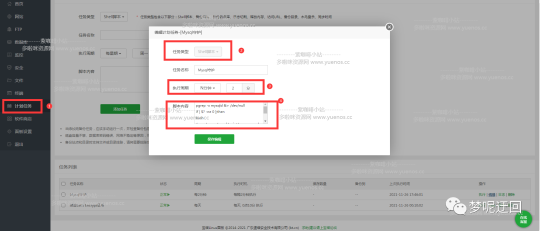 登陆宝塔后台-计划任务-添加Mysql守护,执行周期,可选择多长时间执行一次,比如10分钟监控执行一次,具体的周期请站长根据自己服务器实际情况来设置。