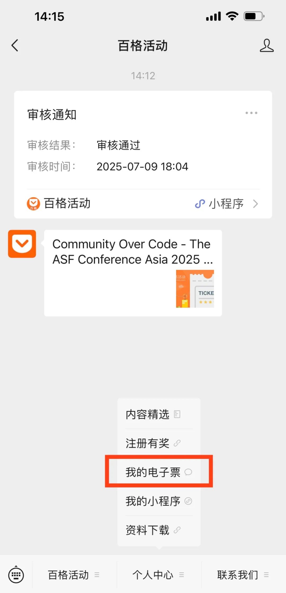 点击底部菜单栏,并选择【我的电子票】绑定您在报名系统中输入的手机号码,即可查看大会门票。