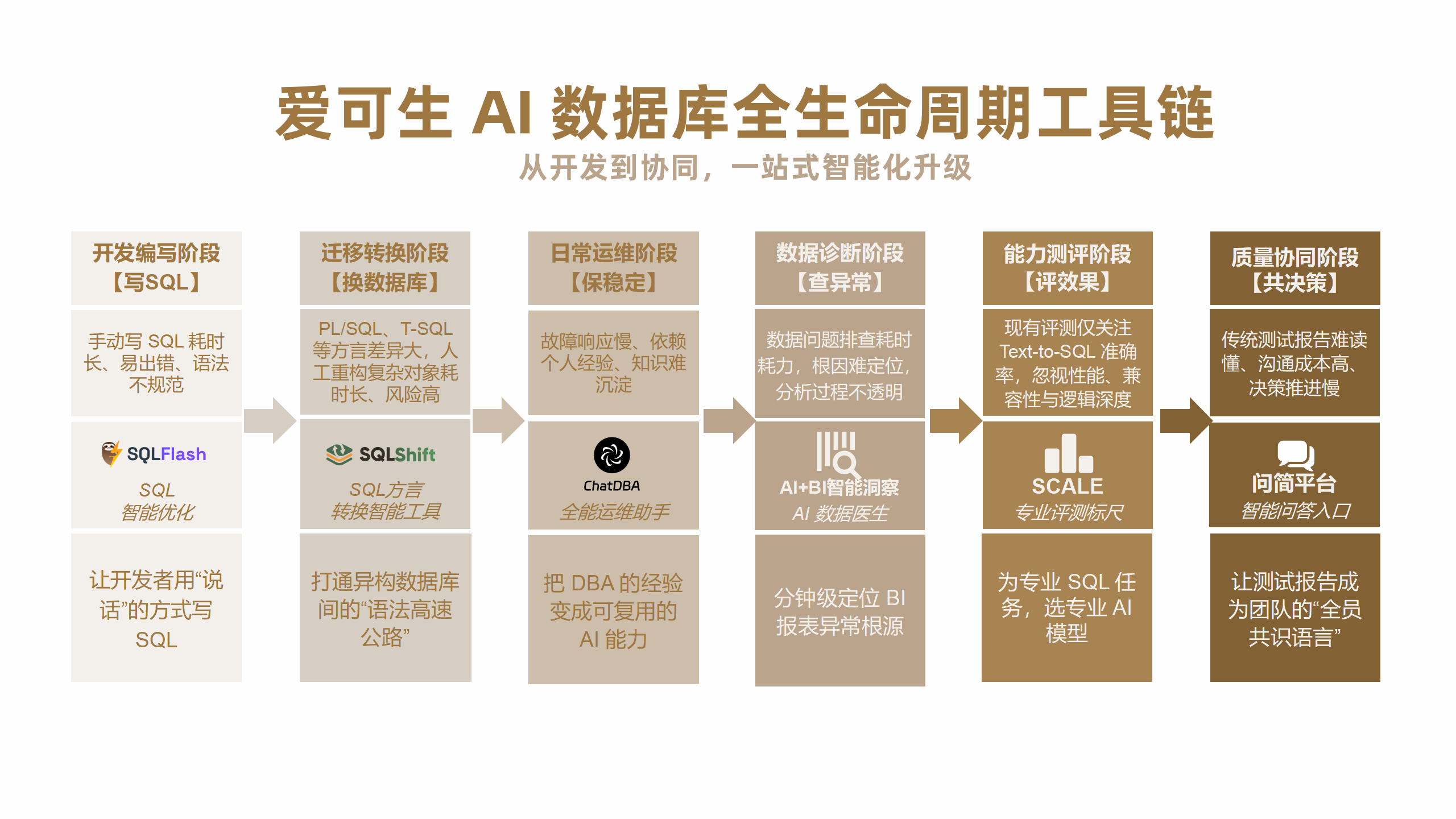 从运维优化到迁移转换,从数据诊断到模型评测,爱可生 AI 产品矩阵在五大前沿方向实现了全面且有侧重的覆盖。各产品凭借差异化能力构建协同生态,以“场景化 + 专业化”的技术落地,为数据库智能化升级提供了全栈式解决方案。