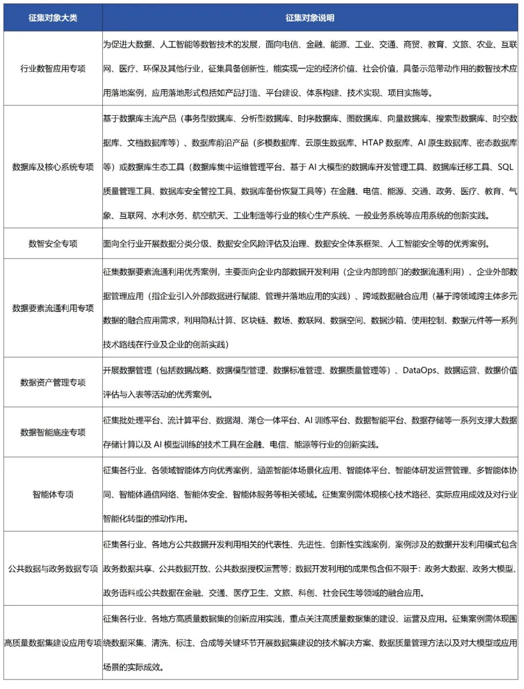 本届星河案例共设立行业数智应用、数据库、数智安全、数据要素流通利用、数据资产管理、数据智能底座、智能体、公共数据与政务数据、高质量数据集建设应用专项,共九大专项。