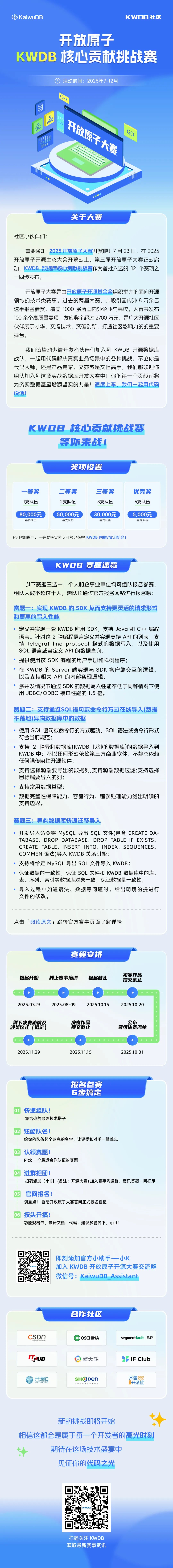 KWDB 社区是一个开放、平等的数据库开源社区。我们希望通过对 KWDB 数据库的社区贡献、开源创新,推动数据库领域的技术发展与落地实践,为更多的用户赋能,打造更广泛的数据库生态。2024年,KWDB 在开源不到半年的时间内,即获得“2024 OSCAR尖峰开源项目及社区”、 “GVP — Gitee 最有价值开源项目”、“2024 年度数据库领域国内活跃开源项目”等荣誉,是《2024 中国开源年度报告》中唯一入选“2024 全球新势力项目 OpenRank 排行榜 Top10”的中国项目。