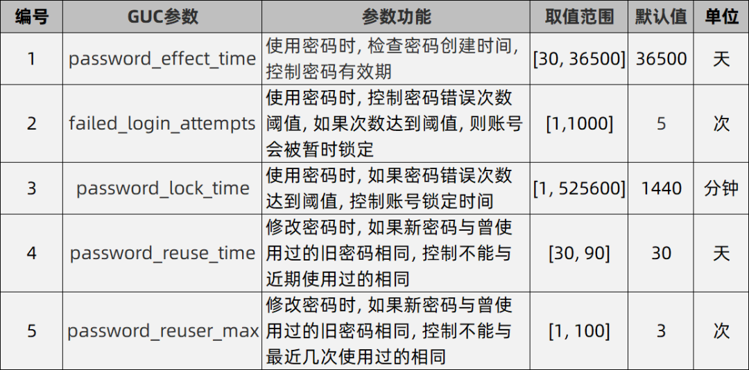 -- 参数取值可设置为 unlimited,即对相关功能不做限制。例如将password_life_time设置为unlimited,表示密码永远不会过期