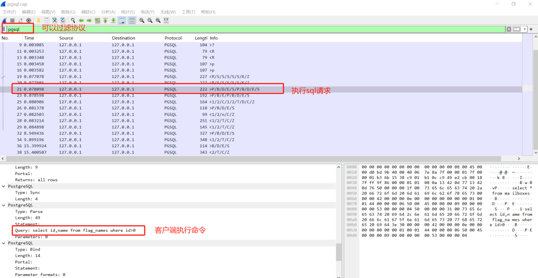 双击打开wireshark,打开tcpdump命令运行后产生的文件即可对数据库包进行分析。