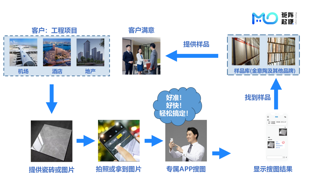金意陶是一家专注于瓷砖产品研发与销售的企业,其产品种类丰富,用户在选购过程中需要快速找到符合需求的产品。然而,传统的产品检索方式(如通过关键词或型号搜索)难以满足销售与客户沟通时候的快速选型需求。金意陶希望构建一个基于图像搜索的智能平台,支持销售通过拍照、上传图片或输入文字来精准找到相关产品,同时查询库存信息,从而提升客户体验并优化销售效率。