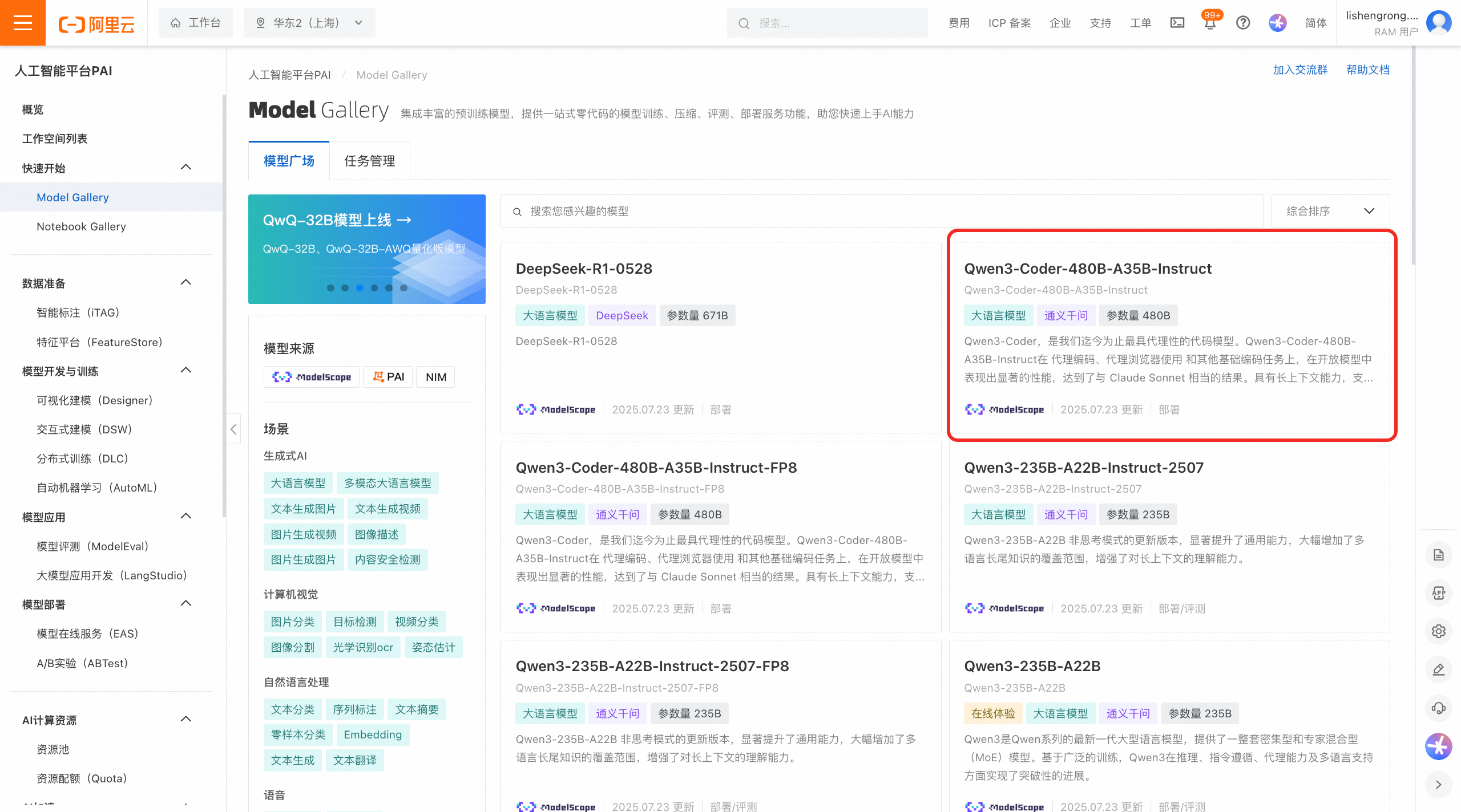 - 在 PAI-Model Gallery 模型广场找到 Qwen3-Coder-480B-A35B-Instruct 模型,或通过链接直达该模型:https://pai.console.aliyun.com/#/quick-start/models/Qwen3-Coder-480B-A35B-Instruct/intro