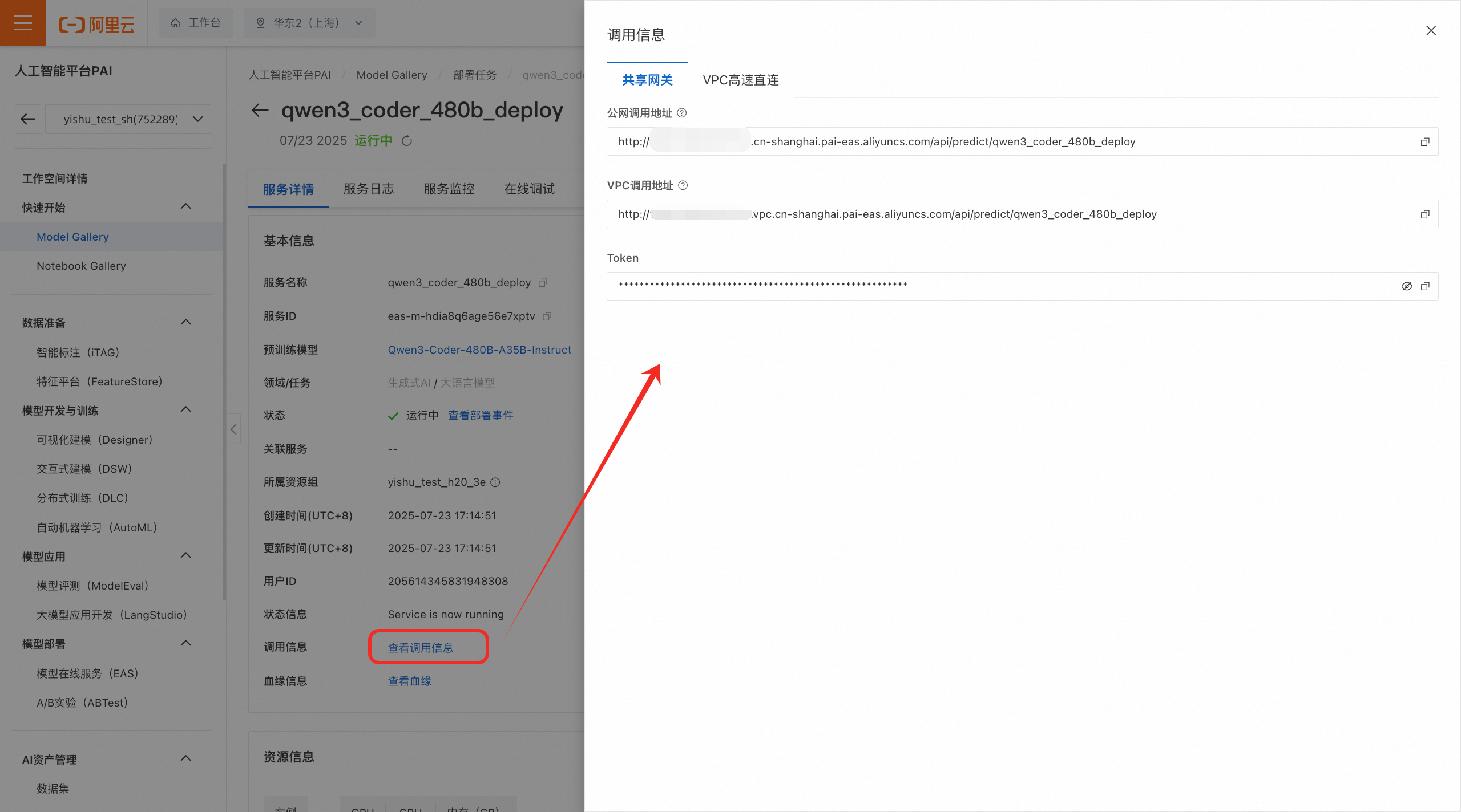 - 部署成功后,在服务页面可以点击“查看调用信息”获取调用的 Endpoint 和 Token,想了解服务调用方式可以点击预训练模型链接,返回模型介绍页查看调用方式说明。