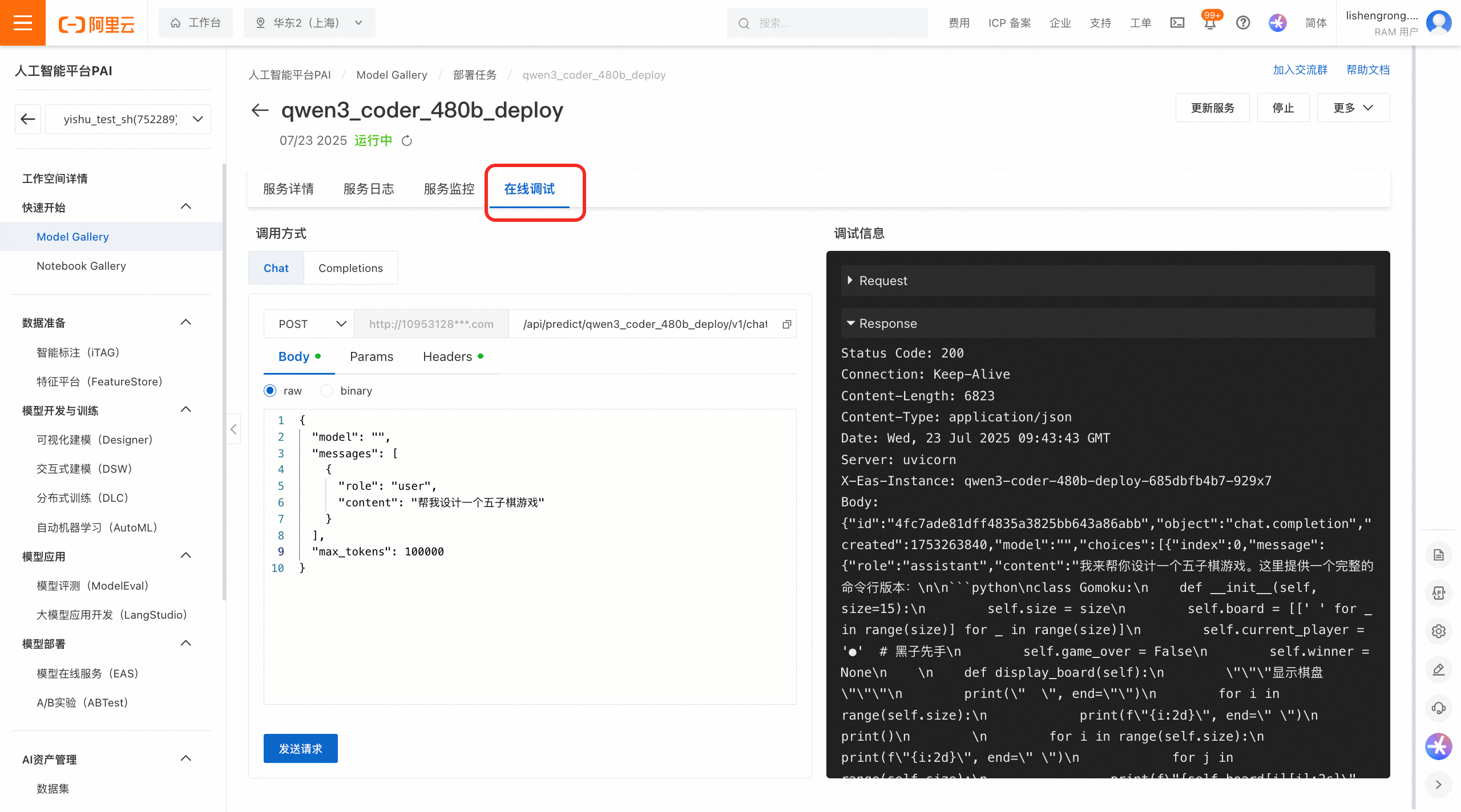 由于 Qwen3-Coder-480B-A35B-Instruct 模型的参数量达 480B,需要至少 16*96G 显存的计算资源进行推理,云端部署成为企业用户和开发者们部署 Qwen3-Coder-480B-A35B-Instruct 时的优先选择。阿里云 PAI-Model Gallery 已同步接入 Qwen3-Coder-480B-A35B-Instruct 模型,提供企业级部署方案。