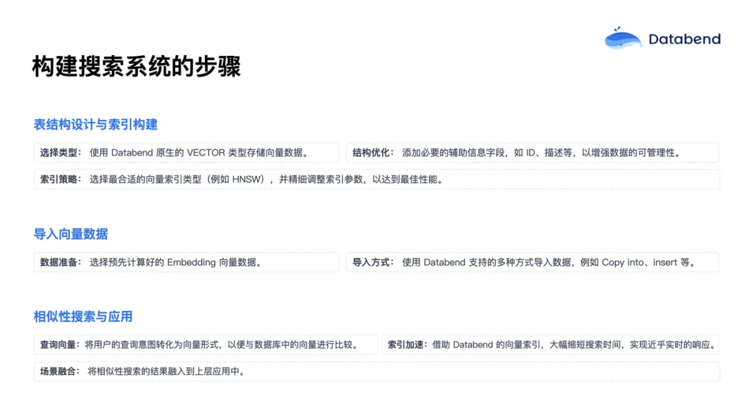 第三步、实现相似度搜索和应用。 用户查询词会先转换为向量,然后利用 Databend 的向量索引大幅缩短查询时间,最终将查询结果与上层应用结合起来。