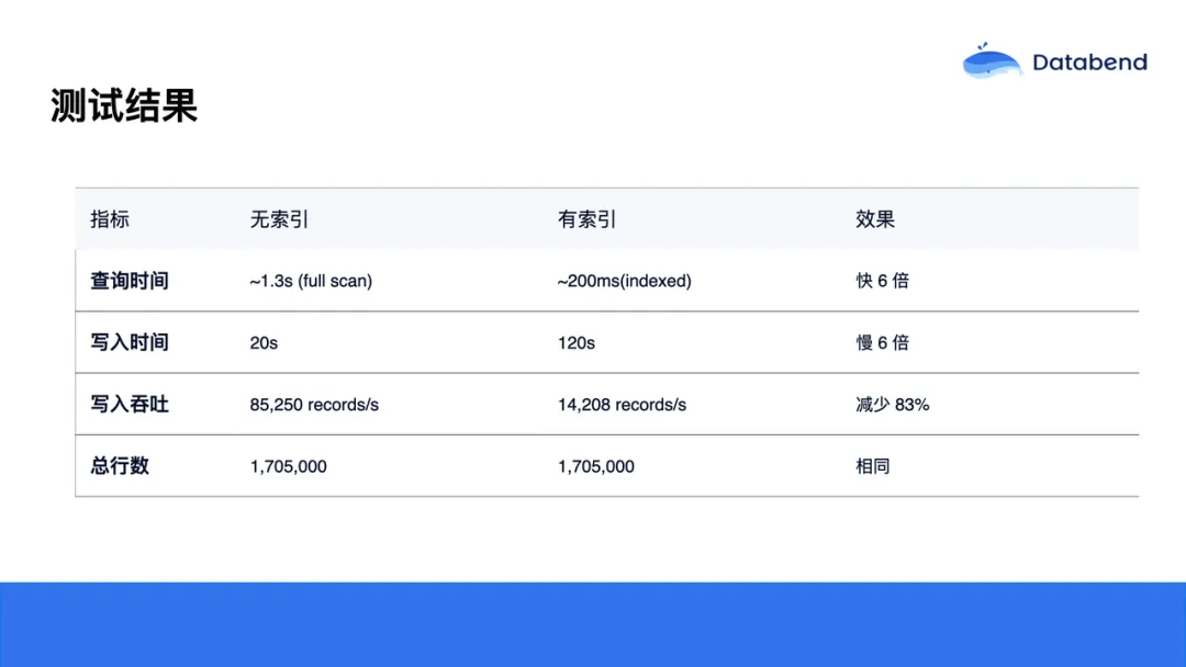测试结果中,未加索引的表在查询时通常耗时都在一秒以上,大约 1.3s 左右。而加了索引后是 200ms,差距为 6 倍。此外,我们还对写入性能进行了测试。由于加索引会同步写入索引数据,写入耗时也有所增加:无索引时写入约需20秒,带索引时则增加到120秒。尽管写入速度变慢,但在实际业务中,查询的频率通常远高于写入,因此这一牺牲是可以接受的。