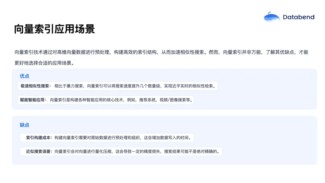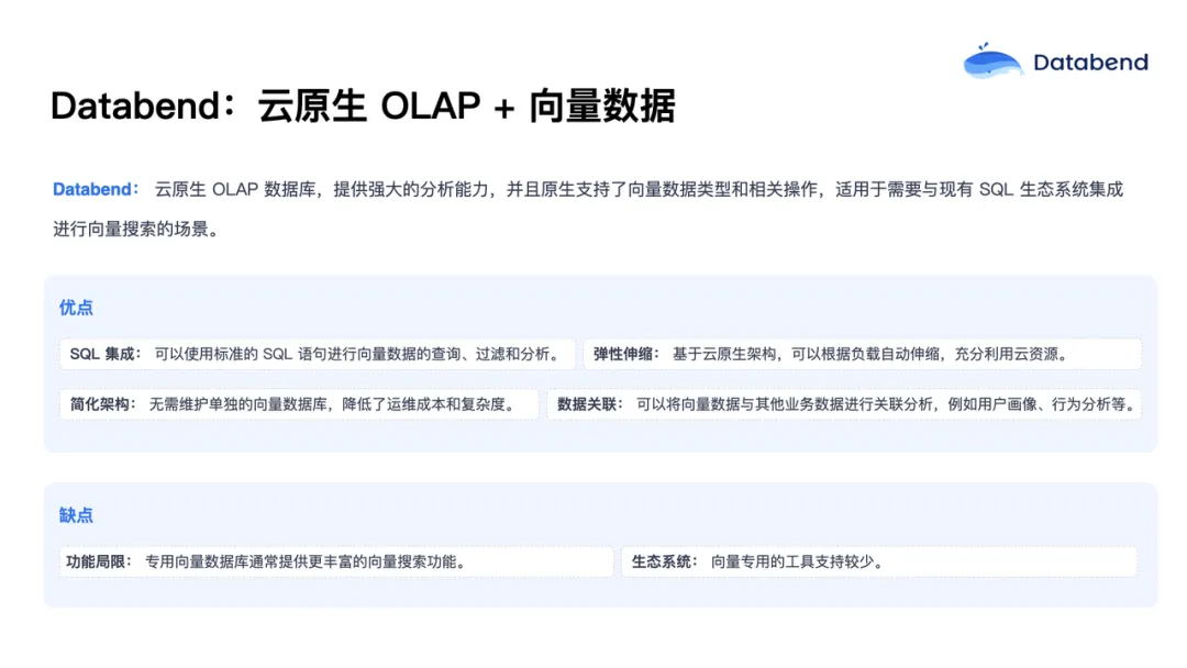 Databend 作为云原生 OLAP 数据库,在原生支持向量数据类型后,可以为需要融合结构化和向量数据分析的场景,提供更强大的能力。用户可以通过标准 SQL 语句进行向量数据的查询和搜索,充分利用 Databend 自带的弹性扩缩架构优势,无需单独部署和运维向量数据库,极大降低了整体运维成本。同时,向量数据也可以与其他业务数据融合分析,助力更多创新应用的落地。当然,目前 Databend 在向量方面的功能和生态还不如专业向量数据库丰富,工具链也有待完善。