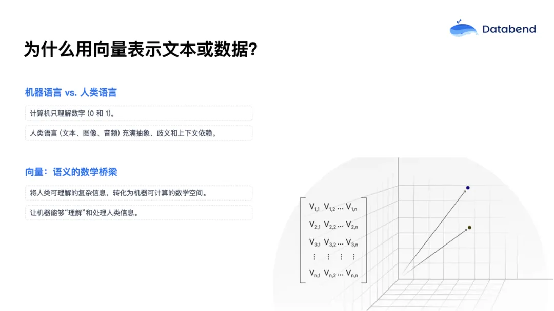 由于计算机只能理解数字,而人类交流主要依赖于文本、图像、音频等丰富的信息,这些数据存在大量歧义和复杂的上下文。如果没有合适的向量类型,计算机很难理解和处理这些非结构化数据。向量数据正好充当了桥梁,把人类复杂的信息转化为计算机能够处理的数字空间,从而让机器能够“理解”人类的信息。