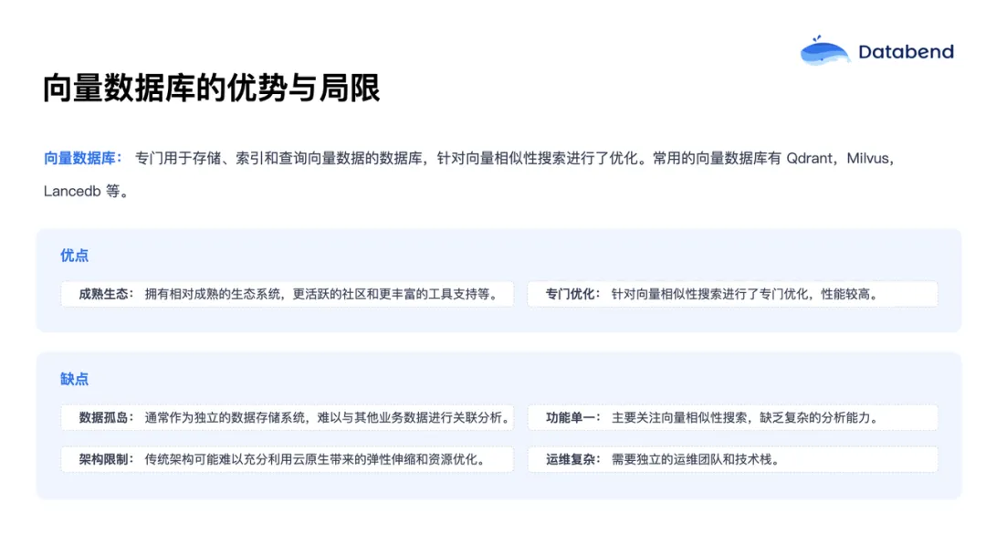 目前业界已经有多种专门面向向量检索的数据库产品,例如 Qdrant、Milvus、Lancedb 等。这类数据库的优势是生态成熟、工具完善、针对相似性搜索做了专门优化。但其不足也比较明显:第一,易形成数据孤岛,难以与业务数据关联分析;第二,功能较为单一,无法支持更复杂的数据分析场景;第三,架构封闭,难以充分利用云原生平台的弹性和资源优化能力。此外,部署独立的向量数据库通常还需要额外的运维成本。