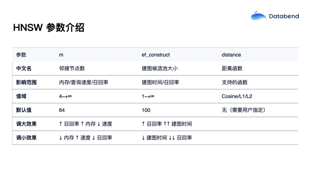 第一步、表结构设计。 得益于 Databend 原生支持向量类型,我们可以直接将向量数据定义为 vector 字段,同时增加如 ID、title 等描述性字段,以提升数据可观测性。此外,还需要选择合适的索引类型,并通过参数调优优化性能。
