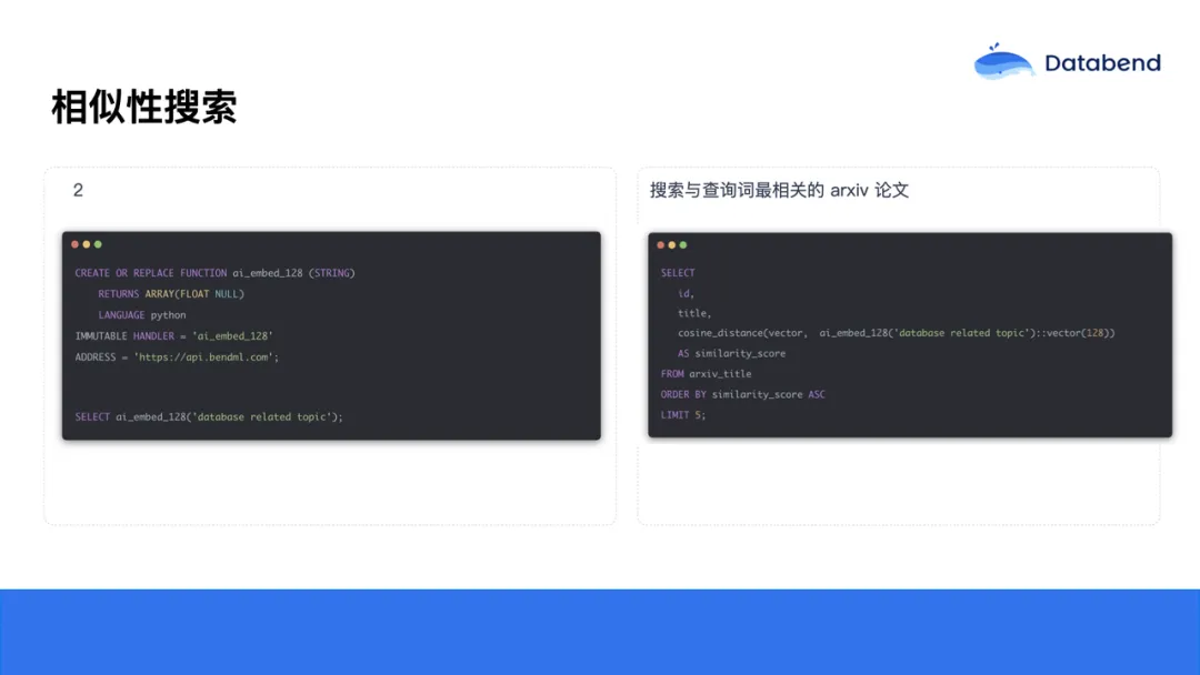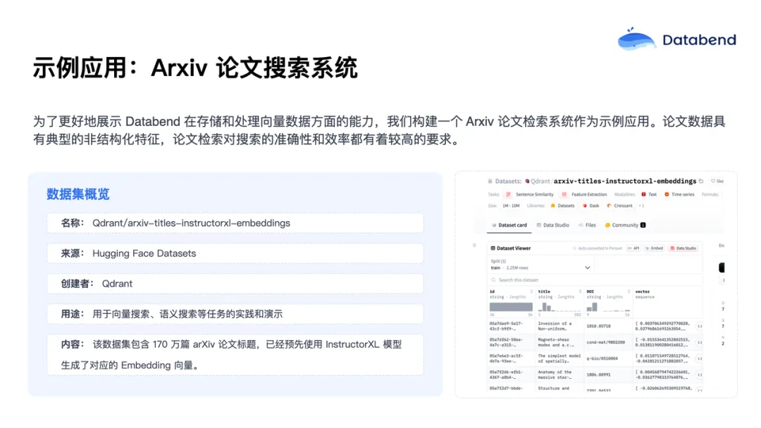 下面通过一个 Arxiv 论文检索系统的示例应用,展示 Databend 在向量数据存储和处理方面的能力。之所以选择论文检索系统,是因为其数据具备典型的非结构化特征,论文的标题和摘要都是文本,需要经过 embedding 技术转换成向量数据。同时,论文检索对搜索的准确性和效率要求很高,能够充分体现向量索引技术的优势。