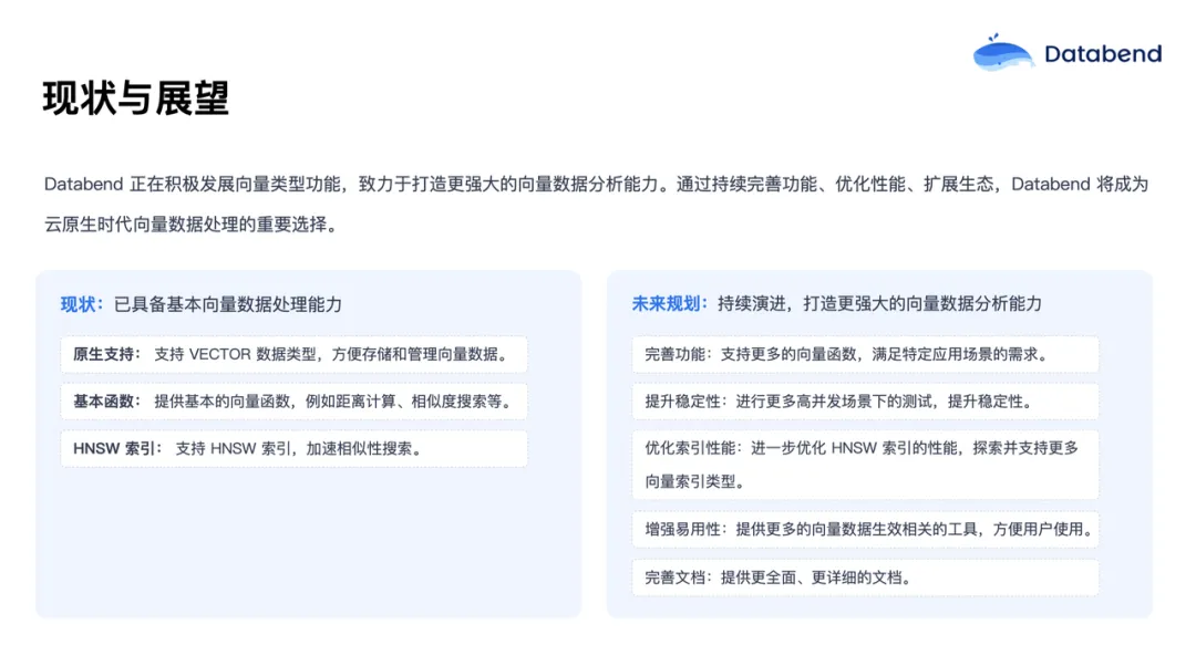 Databend 现阶段已经具备了原生向量数据类型的支持,提供了基本的向量函数和 HNSW 索引。未来将不断完善功能,持续提升索引的性能与稳定性,丰富应用场景,开发更多与向量数据相关的工具,优化文档体验,方便广大用户使用。