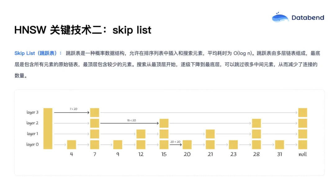 第二项技术是 跳表 ( Skip List ) ,引入了分层结构。最底层包含所有原始数据,越往上每层包含的数据越少,最顶层仅有极少数抽样节点。检索时,从顶层开始,逐层向下缩小范围,大幅减少搜索路径。比如在查找 20 这个数时,从第三层仅需遍历 3 个节点,而若从最底层遍历则要经过 6 个节点,分层结构显著提升了检索效率。