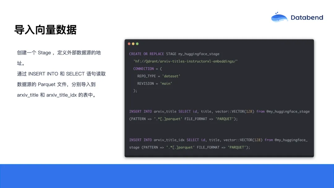 数据导入流程如下:首先创建一个 stage。Databend 中的 可以理解为数据存放区,既可以是本地文件系统,也可以是像 S3 这样的云平台,或者这里用到的 Hugging Face。通过 stage,能够高效地将外部数据读取到 Databend 中,非常适合大规模数据集。