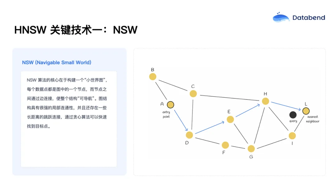 第一,NSW(Navigable Small World) ,即小世界图结构,每个数据点是一个节点,节点之间通过边相连,形成可导航的网络。查询时,可以从任意节点出发,沿着最短路径逐步靠近目标。例如,从点a出发,比较其相邻点b和d与目标的距离,选择更近的d,然后继续比较d的邻居,依次前进,最终找到最接近目标的点。