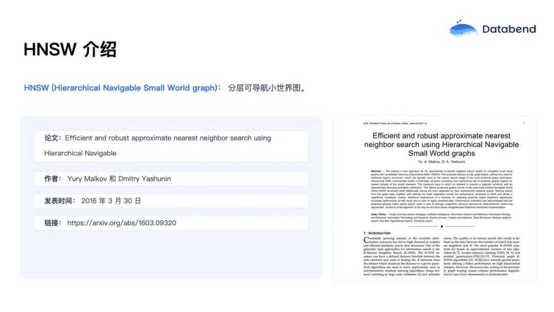 HNSW,全称“Hierarchical Navigable Small World graph ” (分层可导航小世界图),源自 2016 年的一篇论文。这一算法已成为向量检索领域的核心参考,大多数主流向量索引实现都基于此论文。如果大家感兴趣,可以在 arXiv 等网站上查阅原文。