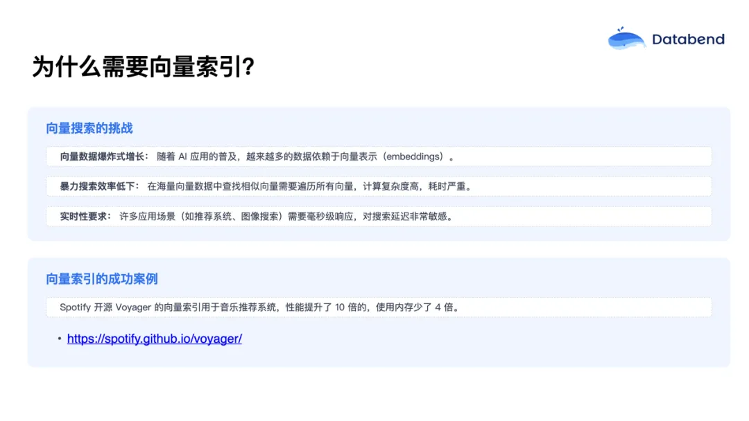 许多实际场景如推荐系统、图像搜索等对响应时间有极高要求,需要毫秒级的实时反馈,暴力搜索显然无法满足需求。使用索引则能大幅提升检索效率。例如,Spotify 开源的向量搜索库 Voyager,用于音乐推荐系统后,检索性能提升了 10 倍,同时内存消耗减少了4倍,充分说明向量索引在实际中的巨大价值。