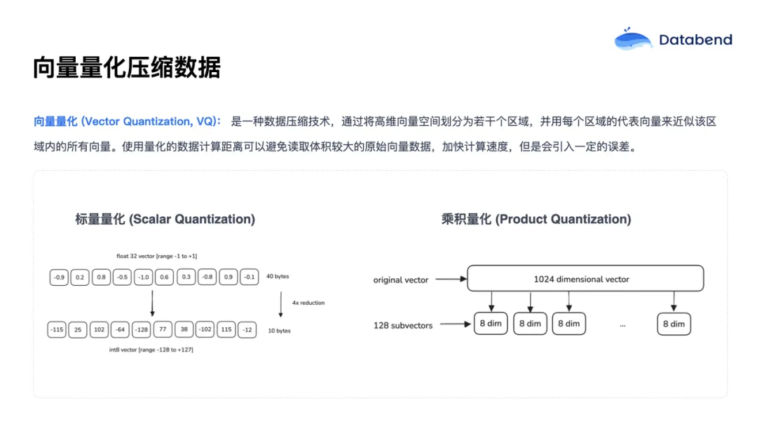接下来介绍一项关键的向量压缩技术——向量量化。向量量化的主要目的是对原始向量数据进行压缩。因为在索引和检索的过程中,需要频繁计算查询向量与原始向量之间的距离。如果每次都读取全部原始数据,将导致数据读取量过大,影响查询效率。为了减少数据体积、提升检索速度,我们通常会对原始向量进行量化压缩处理。