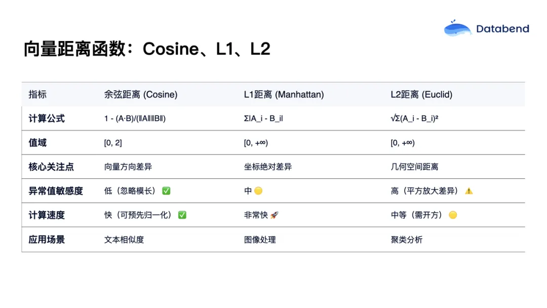 前面我们介绍了距离的计算方式。实际应用中,常见的距离函数有三种:余弦距离(cosine)、L1 距离和 L2 距离。三者的主要区别在于计算公式不同,适用场景也有差异。一般来说,如果数据是高维且稀疏,并且只关注向量的方向,则适合用余弦函数;如果数据稠密,只需要计算向量的直线距离,L2 距离更合适;若数据中包含较多异常值、各维度差异较大,则 L1 距离更为合适。实际应用中,可根据具体场景进行选择和调优。