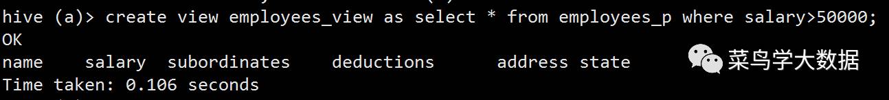 可以看到,可创建表的语法差不多。我们创建了一个视图,这个视图是原表employees_p中salary>50000的所有记录。我们将这个视图记为employees_view。接下来我们可以在这个视图中进行其他操作。