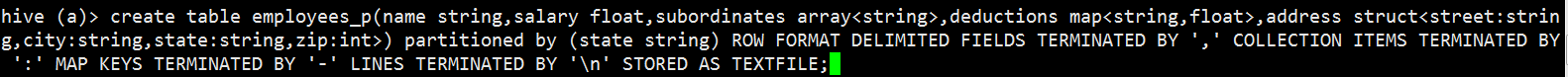 hive (a)> create table employees_p(name string,salaryfloat,subordinates array<string>,deductions map<string,float>,addressstruct<street:string,city:string,state:string,zip:int>) partitioned by(state string) ROW FORMAT DELIMITED FIELDS TERMINATED BY ',' COLLECTION ITEMSTERMINATED BY ':' MAP KEYS TERMINATED BY '-' LINES TERMINATED BY '\n' STORED ASTEXTFILE;