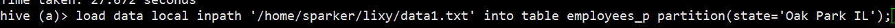 hive (a)> load data local inpath '/home/sparker/lixy/data1.txt' into table employees_p partition(state='Oak Park IL');