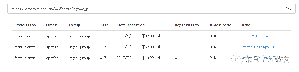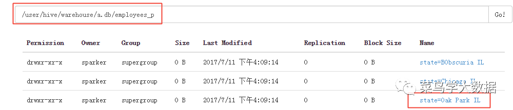 发现表employees_p下多了文件夹state=Oak Part IL,这个就是我们导入数据时指定的partition的字段值。