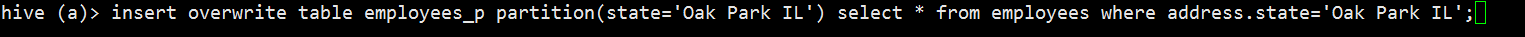 hive (a)> insert overwrite table employees_p partition(state='Oak Park IL') select * from employees where address.state='Oak Park IL';