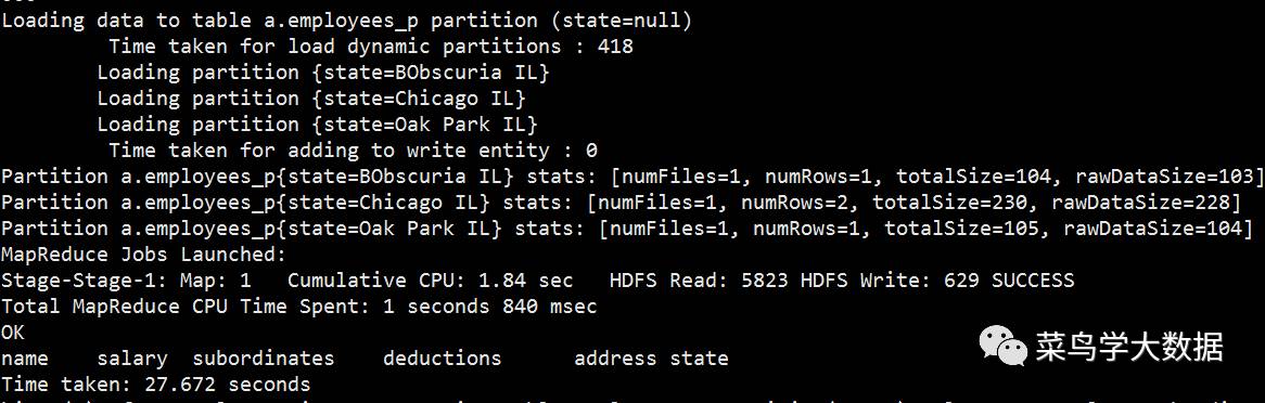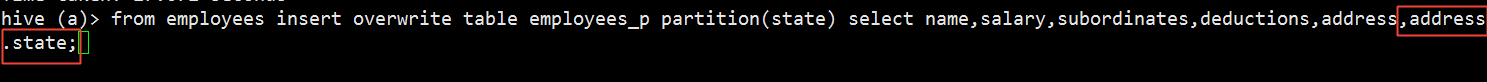 from employees insert overwrite table employees_p partition(state) select name,salary,subordinates,deductions,address,address.state;