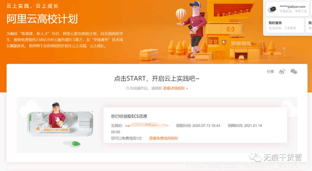 接着出现购买的云服务器概述,博主这里免费领取的6个月服务器拿来重新安装进行测试,点击云服务器实例ID