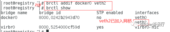 brctl addif docker0 veth2,将veth2加入网桥