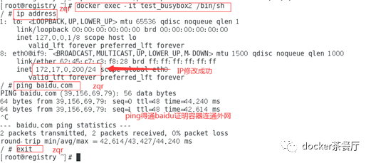 ip netns exec$pid2 ip addr add 172.17.0.200/24 dev eth0,在namespace中指定IP地址