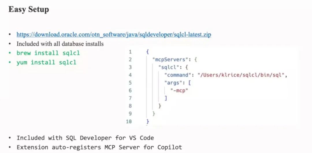 另外值得我们注意的是,Oracle基于现有的SQLcl工具,增强开发MCP功能,而不是另起炉灶,这是Oracle比较独特的地方,算是一个关键决策。
