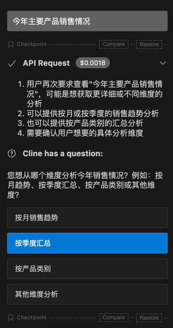 结果它非常聪明的识别到是相同问题,猜我是想获取更多维度的信息,还直接给我提供了一些维度选择,非常贴心!