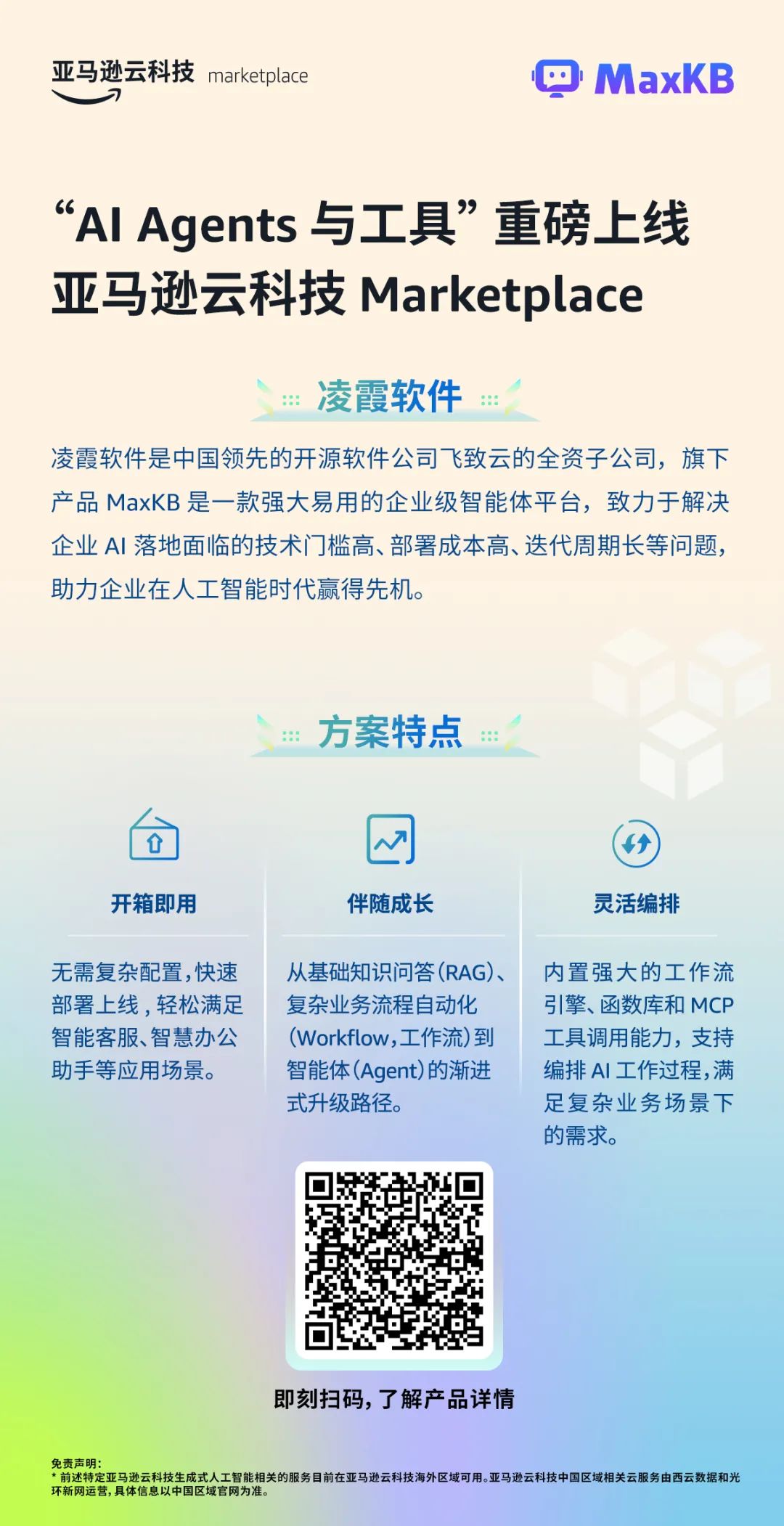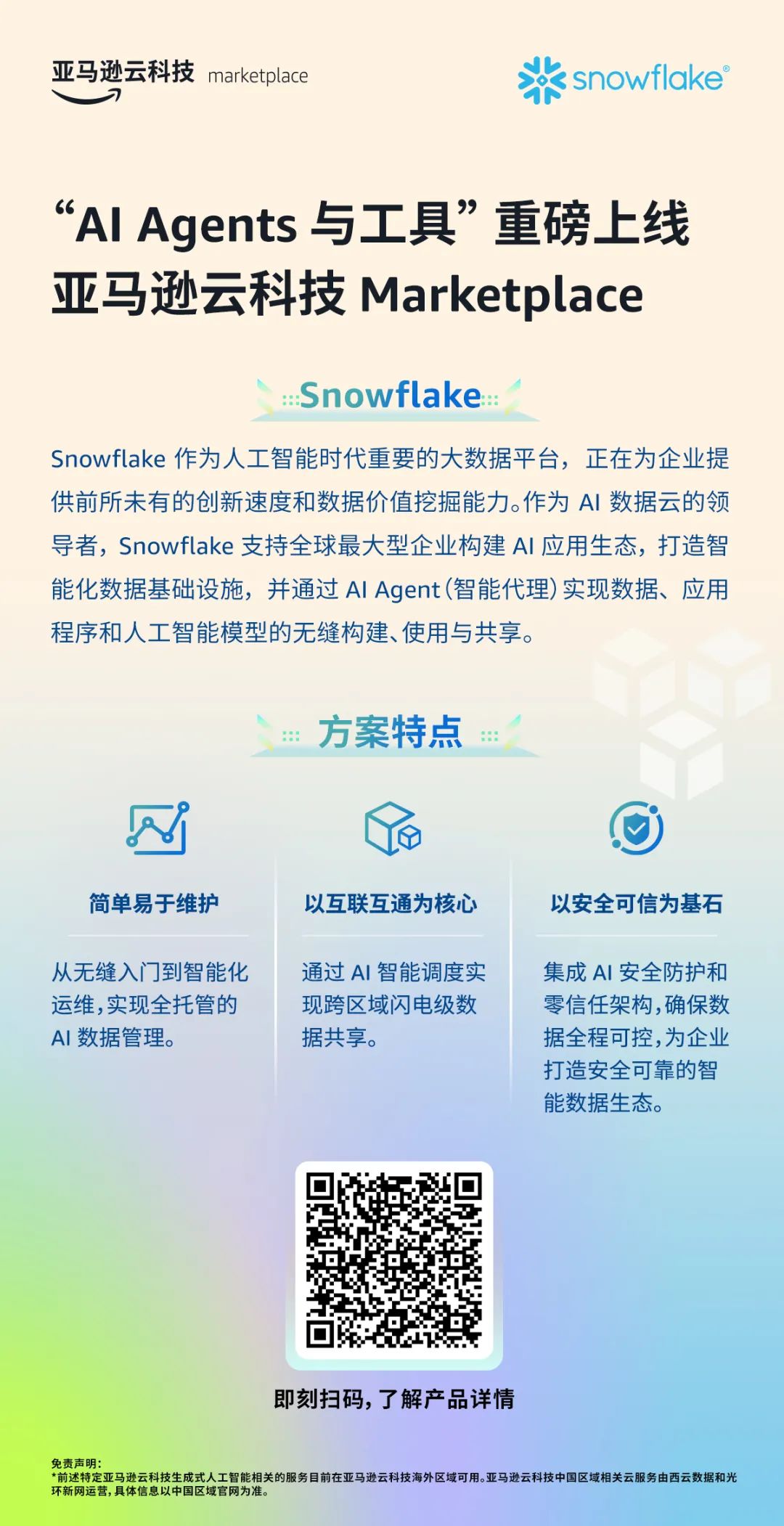 面对日益碎片化的AI环境,亚马逊云科技Marketplace构建了行业首个集中式资源中心,汇聚亚马逊云科技合作伙伴精选的Agent、工具与解决方案,包括Anthropic、Automation Anywhere、C3.ai、IBM、KariniAI、Kloia、Perplexity、PwC、Salesforce、Stripe、Trellix、Upstage、VNGRS、xpander.ai等等。借助合作伙伴的预置Agent,企业可快速实现自动化能力跃迁。当基础构建模块与预置方案形成组合战略时,企业将突破实验沙盒,构建出可驱动可量化商业变革的全栈式AI战略体系。