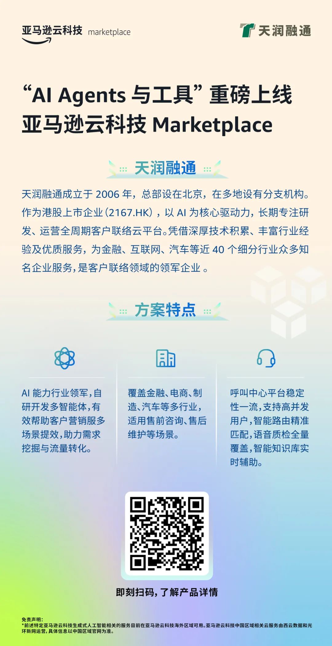 通过由Amazon Bedrock提供支持的新AI搜索,客户很容易找到合适的Agent。客户可以描述他们的用例,AI搜索推荐满足需求的解决方案。基于API的新型部署架构进一步简化集成流程,无缝兼容支持模型上下文协议(Model Context Protocol)与Agent‑to‑Agent(A2A)标准的各类Agent工具。