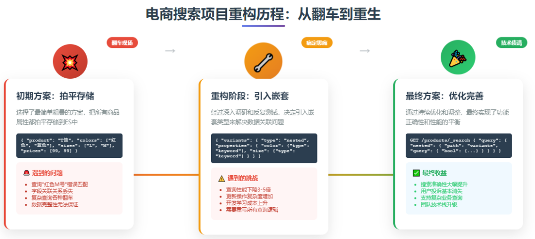 如果让我重新设计这个系统,我可能会采用混合的方案。对于核心的商品规格查询,继续使用嵌套类型,保证准确性。对于一些辅助的统计分析场景,可能会用扁平化的设计,提高查询效率。没有完美的方案,只有最适合的选择。