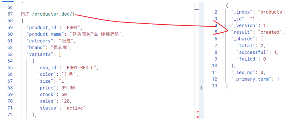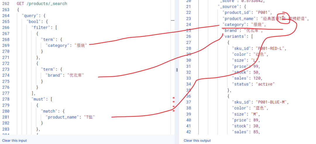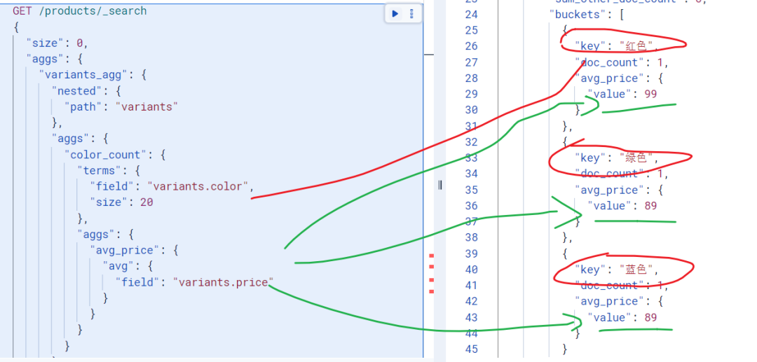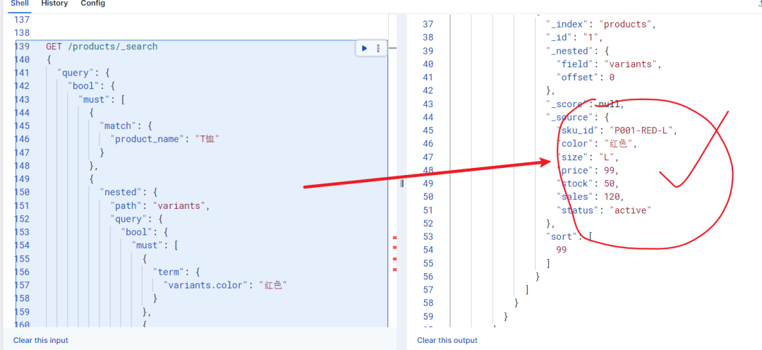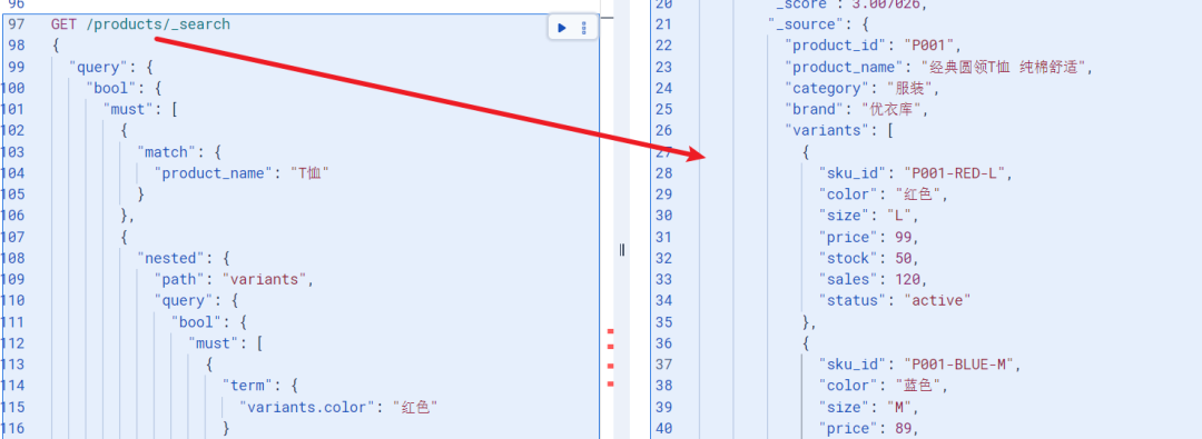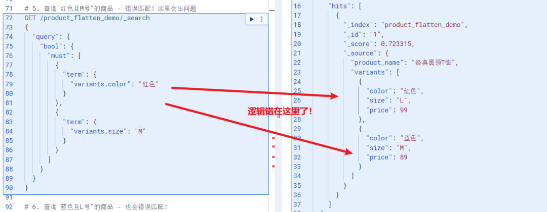 看起来没什么问题对吧?但当我们想查询"红色且L号" 的商品时,ES 会把 variants 数组中的所有字段都拍平处理,变成:color: ["红色", "蓝色"],size: ["L", "M"],price: [99, 89]。