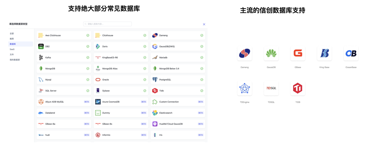 TapData 的核心技术能力集中体现在 TapCDC 模块。它具备对多种数据库的日志解析与结构适配能力,能够在不依赖源端业务改造的前提下实现增量数据捕获。在信创环境中,它已成功支持如:达梦数据库(Dameng)、华为 GaussDB、南大通用(GBase)、金仓数据库(KingbaseES)等主流国产数据库。